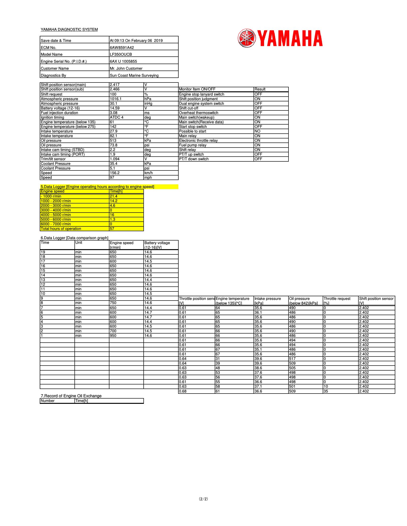 Marine Engine Diagnostics is the analysis of the engine’s built in computer system. This is done by connecting to the engine’s Electronic Control Module (ECM). The computers and software we use has an adapter unique to the engine manufacture to provide valuable information regarding the engines’ history. By connecting into the ECM we can learn valuable information regarding your potential purchase. By doing engine diagnostic scans this enables the surveyor to verify valuable information such as the actual engine hours, the RPM run history so we know how the engines have been operated during their life, current engine fault codes as well as historic fault codes. Engine diagnostics provides valuable information regarding the engine’s history to better enable our customers to make an informed decision before the purchase of the vessel. On inboard powered boats our sophisticated software has the ability to actually record the engines performance during the sea trial. This enables our surveys to verify the helm gauges accuracy and get exact details on the engine’s performance when sea trialing. Engine diagnostics is available as an additional option in conjunction with a marine survey on all gasoline inboard and most outboard engines providing the engines are ECM equipped.