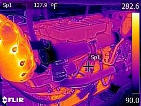 To the left are two images of a Cummins diesel marine engine being operated during a sea trial. The thermal image is on the left and the Thermal MSX® image is on the right.